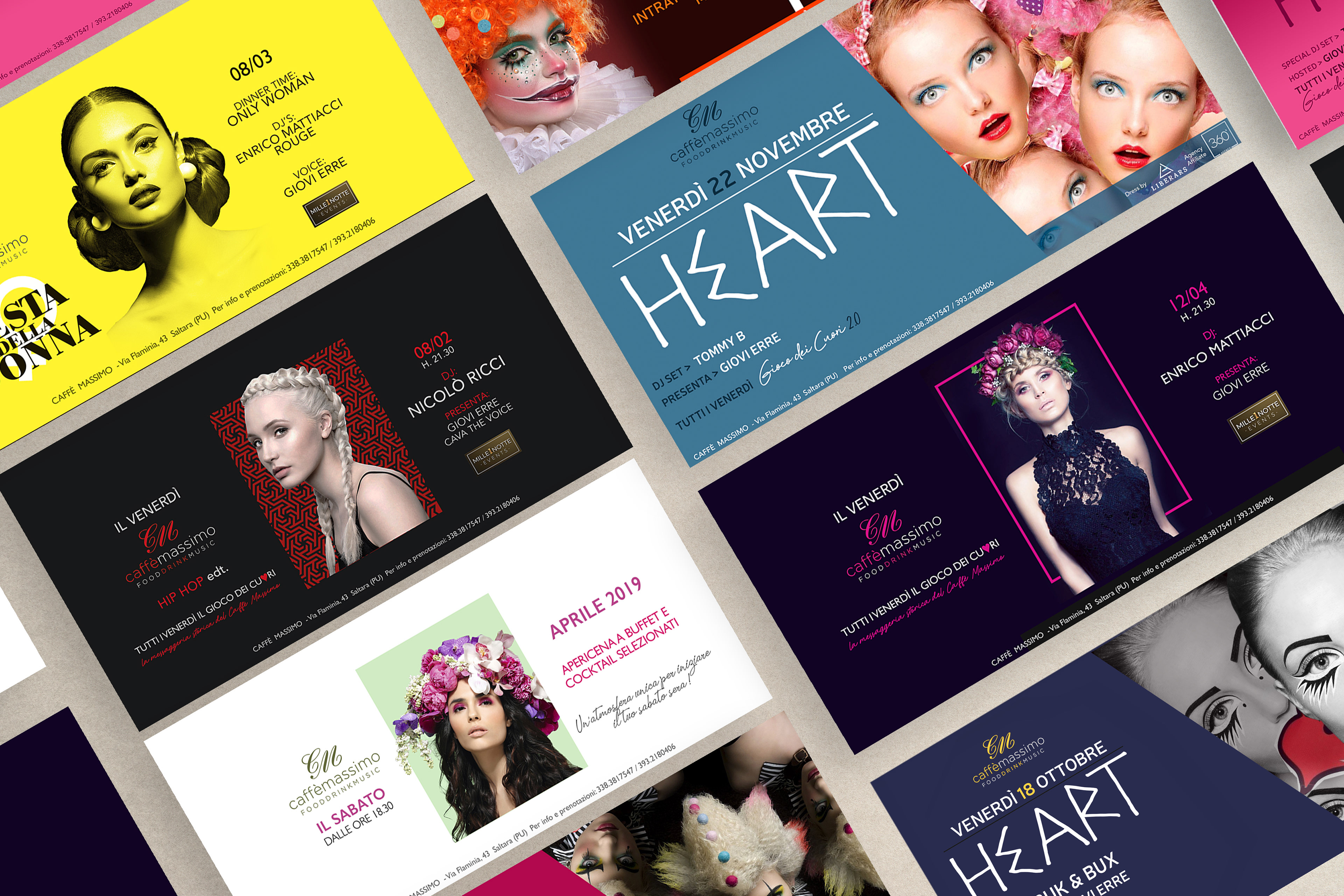 Realizzazione di una progettazione grafica che si basi su un impatto visivo immediato creato da una gestione dinamica dello spazio e dall'utilizzo di immagini e colori a contrasto che raccontino la storia di un locale, i suoi eventi e il suo lifestyle. A seguire alcuni elaborati grafici realizzati per il cliente.